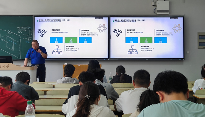 在讲座中,何小平从“餐厨废弃物资源化耦合SOFC发电、生物质气化PSA提制绿氢、沼气提纯及重整制氢”三大技术方向,为草榴社区百余名环境工程、能源化工等相关专业师生带来了一场兼具前沿性与实践性的技术分享。何小平以企业近年来的工程实践为切入点,首先介绍了4MW级SOFC清洁发电技术。他指出,将餐厨废弃物厌氧消化产生的沼气,通过高温燃料电池进行高效电化学发电,可以实现由传统燃烧利用向高效低碳利用的升级,系统发电效率目标可达65%。他重点分享了以“50kW标准单元+多机集成+站级控制”的模块化建站思路,既能适应沼气成分波动,又大幅提升了工程可复制性。